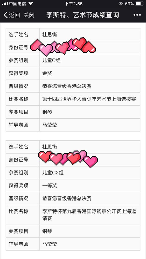 龍丹老師的琵琶學(xué)員夏思齊、陳書(shū)韻及馬瑩瑩老師的鋼琴學(xué)員杜思衡,楊知蓁老師的古箏學(xué)員俞欣妤均獲得了金獎,晉級成功征站總決賽!